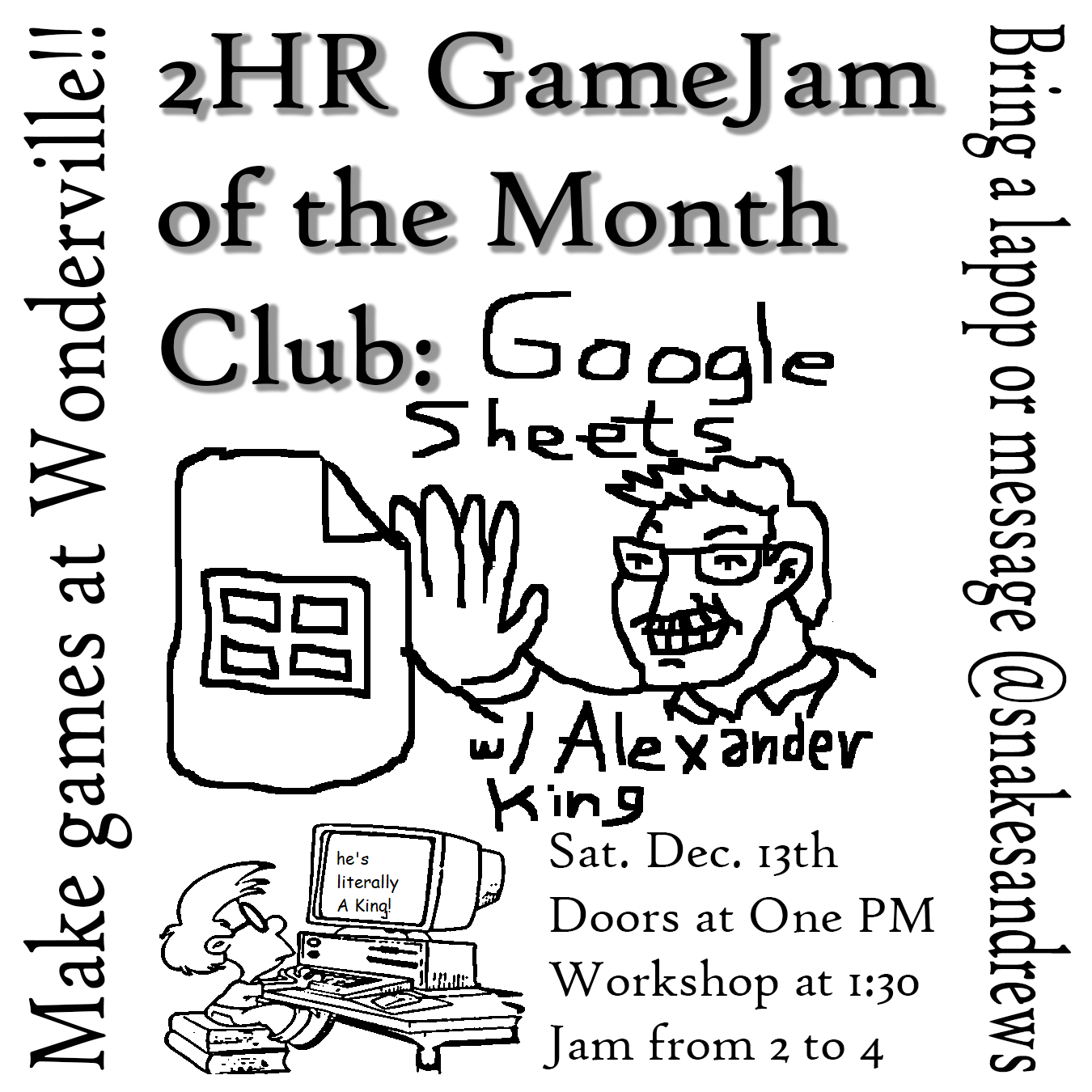 Once a month we host an all-ages game jam on a Saturday afternoon to introduce the community to new tools in game development (hosted by Blake Andrews). Upcoming Game Jams